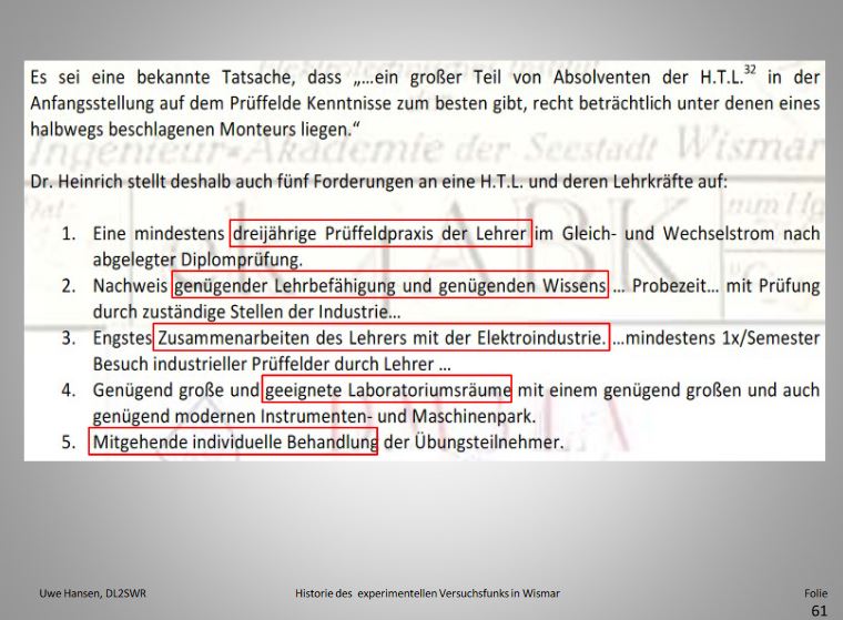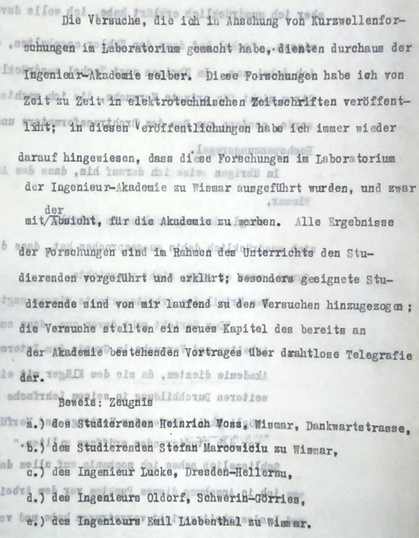 Mit seiner Anstellung 1922 brachte Dr.-Ing. Kurt Heinrich sein in Chemnitz bis dahin privat betriebenes Elektrotechnisches Laboratorium mit ein, insbesondere ein Großteil seiner technischen Ausrüstung. Eine Aufstellung dazu im Brief von Heinrich an Wismarer Bildungsamt 1923 (Abb. links)