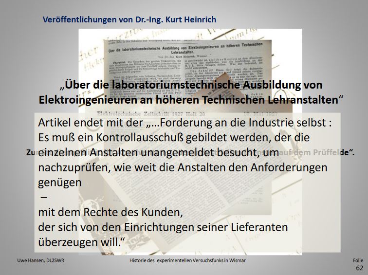 Dr.-Ing. Kurt Heinrich veröffentlichte in den Jahren 1927-1931 mehrere Artikel in der "Elektrotechnische(n) Zeitschrift", dem Zentralblatt Elektrotechnik/ Organ der VDE.