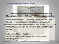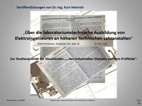 Eine der sonst fachlichen Veröffentlichungen von Dr.-Ing. Kurt Heinrich in der ETZ befasste mit der laboratoriumstechnischen Ausbildung von Elektroingenieuren. Heinrich postulierte dazu Forderungen an die Unternehmen wie auch die höheren Technischen Lehranstalten (H.T.L.). Ein Beitrag, der in der Industrie mit Beifall und in den Hochschulen, einschließlich der eigenen Akademie, zu Diskussionen führte. (vollständig)