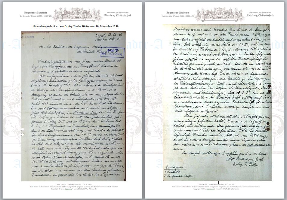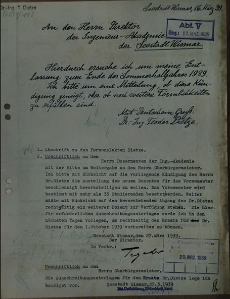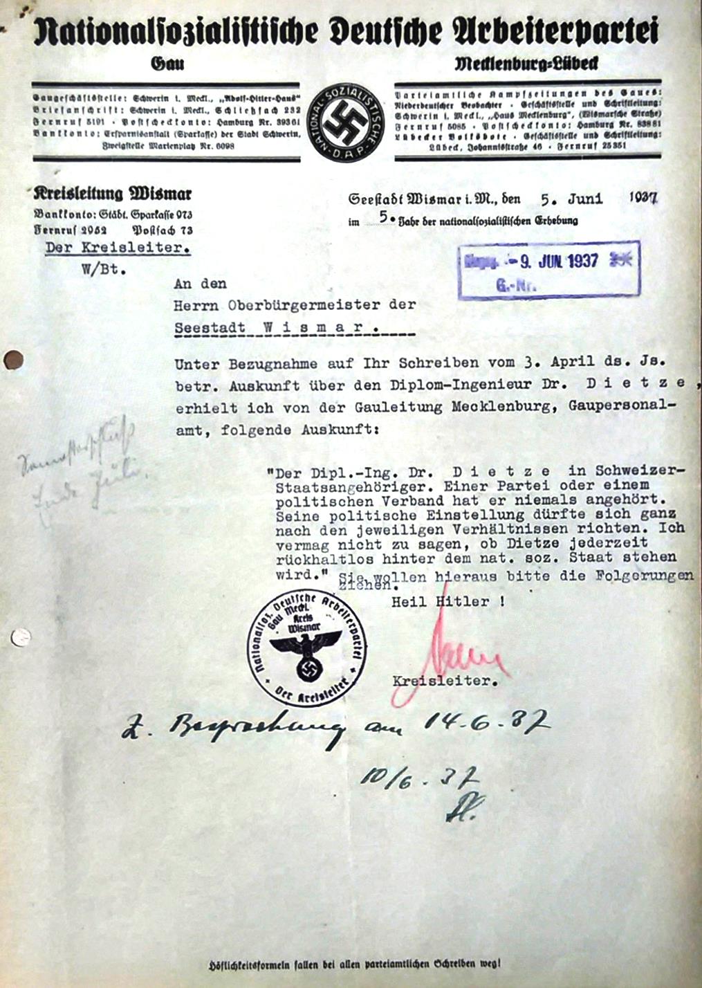 Eine zum Bewerbungszeitpunkt vom Bürgermeister Pleuger angeforderte Einschätzung durch die Partei (NSDAP) bewertet Dietze als Schweizer Staatsbürger als "...nicht jederzeit hinter dem nat. soz. Staat stehen(d)" und...