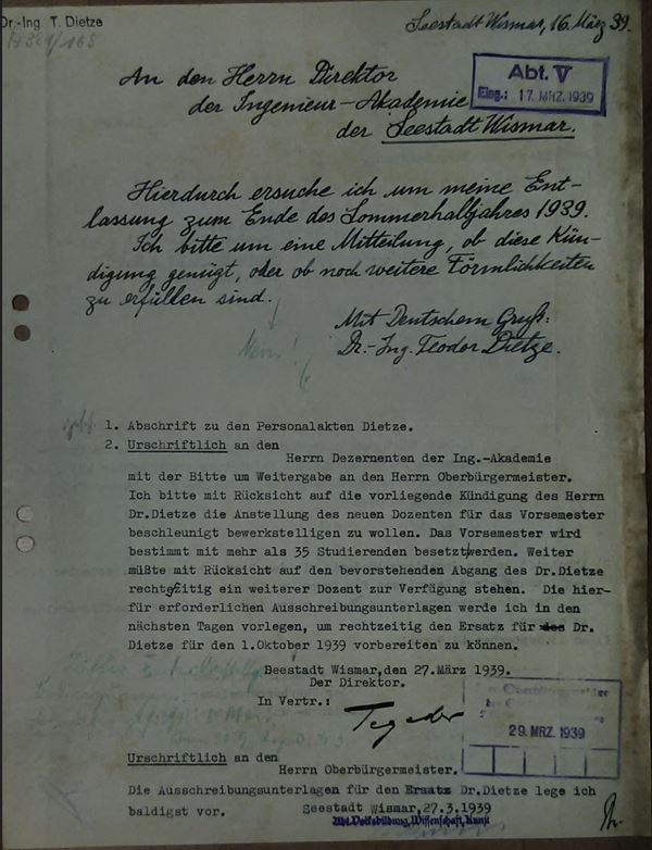 Zum 30. September übergab man Dietze die Papiere, obwohl er auf eine vom Bürgermeister Pleuger mündlich ausgesprochene befristete Weiterbeschäftigung bis April 1938 hoffte. Mitte Oktober 1937 brachte Dietze in einem Brief den Bürgermeister mit dessen früher getätigten Aussagen geschickt unter Druck und verwies abschließend noch auf den deutsch-schweizerischen Gegenseitigkeitsvertrag. All das veranlasste Pleuger zu "persönlicher Rücksprache" mit der NSDAP-Kreisleitung, was wiederum Dietze umgehend im zweiten Anlauf eine positive Bescheinigung erbrachte und die Wiedereinstellung in der Elektrotechnik; sogar rückwirkend ab dem 1. April 1937.