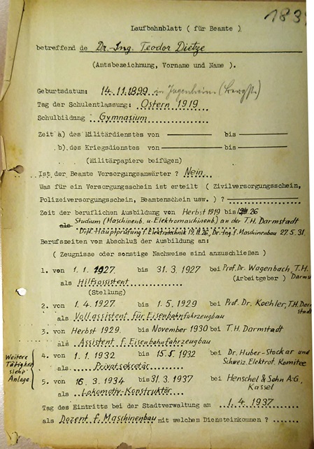Teodor Dietze wurde am 14. November 1899 in Jungenheim an der Bergstaße im Odenwald geboren. Er studierte Maschinen- und Elektromaschinenbau an der TH Darmstadt von Herbst 1919 bis zum 19.11.1926 (Diplomhauptprüfung in Elektrotechnik). Es folgen Assistentenjahre bis zur Promotion (27. Mai 1931) im Eisenbahnfahrzeugbau.