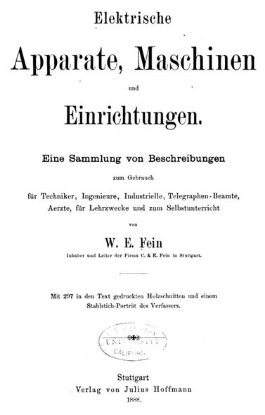 Das heutige Unternehmen, die C. & E. Fein GmbH, kann auf eine stolze Historie seit 1867 verweisen, die auf den Erfinder und erfolgreichen Geschäftsmann Wilhelm Emil Fein zurückgeht. 1888 verfasste er ein frühes elektrotechnisches Standardwerk eigener Produkte - "Elektrische Apparate, Maschinen und Einrichtungen".