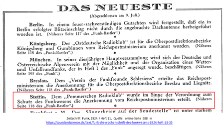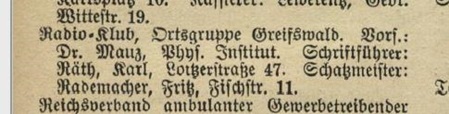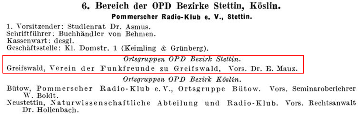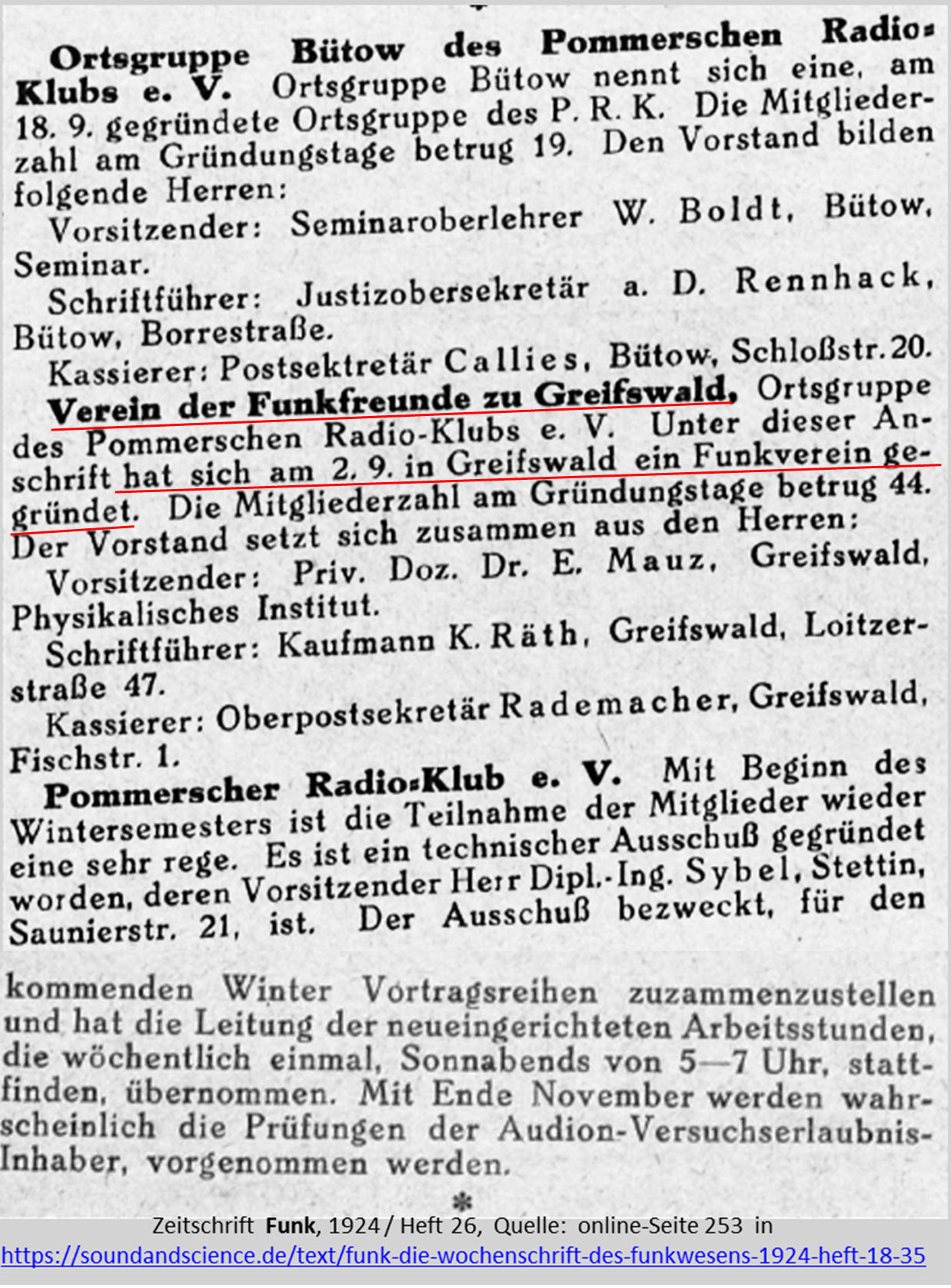 Am 2. September 1924 hat sich der Verein der Funkfreunde zu Greifswald gegründet. Bereits 44 Mitglieder zählte der Verein am Gründungstag. (zur Originalinfo)