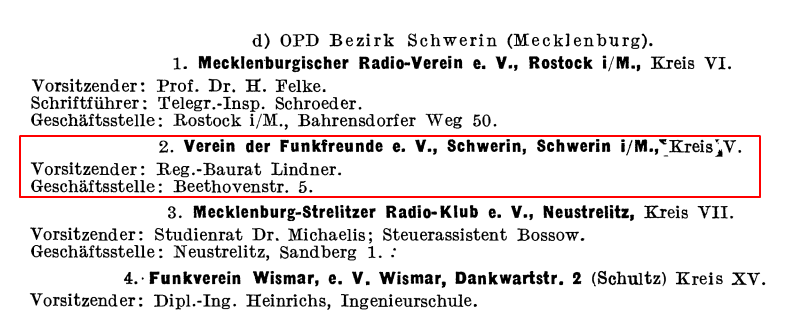 Schwerin gehörte zu den frühen Radio- und Funkvereinen aus dem Oberpost-Direktionsbereich (OPD) Schwerin, die sich zum 24. Januar 1924 im Deutschen Funk-Kartell zusammenschlossen.