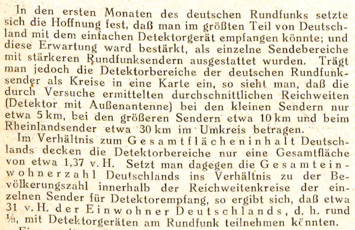 Versuche hatten 1926 ergeben, dass zur Gesamtfläche Deutschlands die Detektorbereiche nur etwa 1,37% decken könnten. Jedoch sind Ballungszentren wie Berlin bevorzugt, so dass immerhin etwa 30% der Bevölkerung die theoretische Möglichkeit hatten, den Unterhaltungsrundfunk mit einem einfachen Detektorgerät empfangen zu können.