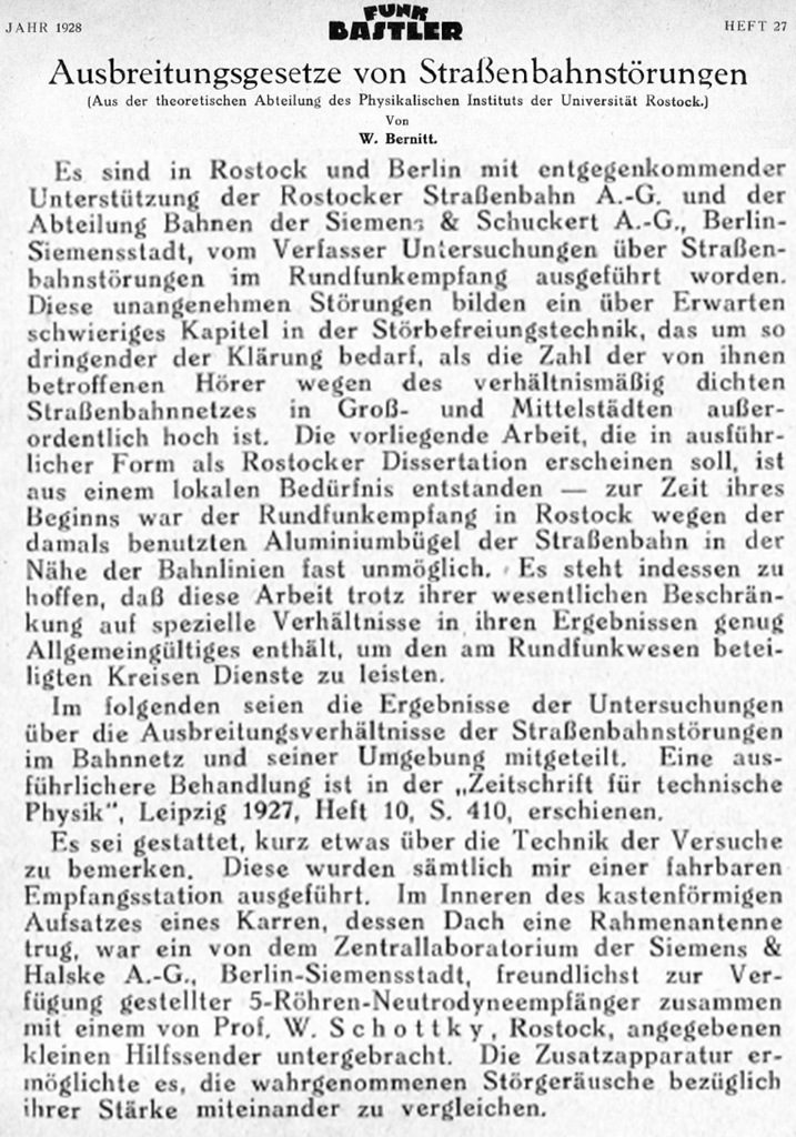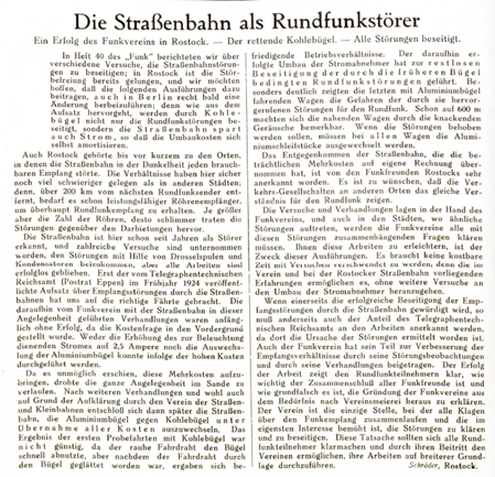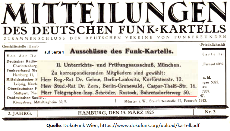 Der Rostocker Telegrafeninspektor und Schriftführer des Vereins Schröder (der auch den Artikel zu den Straßenbahnbügeln schrieb) war im Gremium des Funk-Kartells Mitglied des Unterrichts- und Prüfungsausschusses.