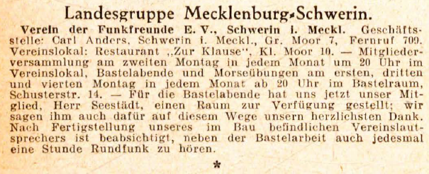 Der vermutlich älteste Funkverein im Bereich vom heutigen Mecklenburg/Vorpommern!