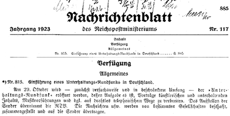 In diesem Jahr vor nun 99 Jahren, am 29. Oktober 1923, hieß es "Achtung, Achtung, hier ist Berlin…“. So begann die erste Sendung eines nun regelmäßigen Unterhaltungs-Rundfunkdienstes in Deutschland. Einen Funkdienst, dessen Benutzung genehmigungspflichtig war und „…dessen Aufgabe es ist, Vorträge künstlerischen und unterhaltenden Inhalts, Musikvorführungen und dgl. auf drahtlos telephonischem Wege zu verbreiten.“