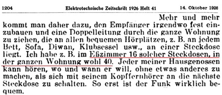 "...Es ist daher unzulässig, daß Rückkopplungsempfänger benutzt werden, welche in die Antenne hineinschwingen. Einigermaßen sicher wird dies nur dadurch vermieden, daß bei einem Mehrröhrenempfänger mit Vorröhre gearbeitet wird, welche aus eigener Heiz- und Anodenbatterie gespeist wird, so daß nicht etwa durch die betreffenden Zuleitungen Energie auf die Antenne übertragen wird."