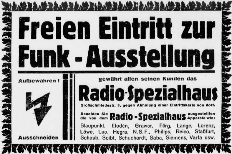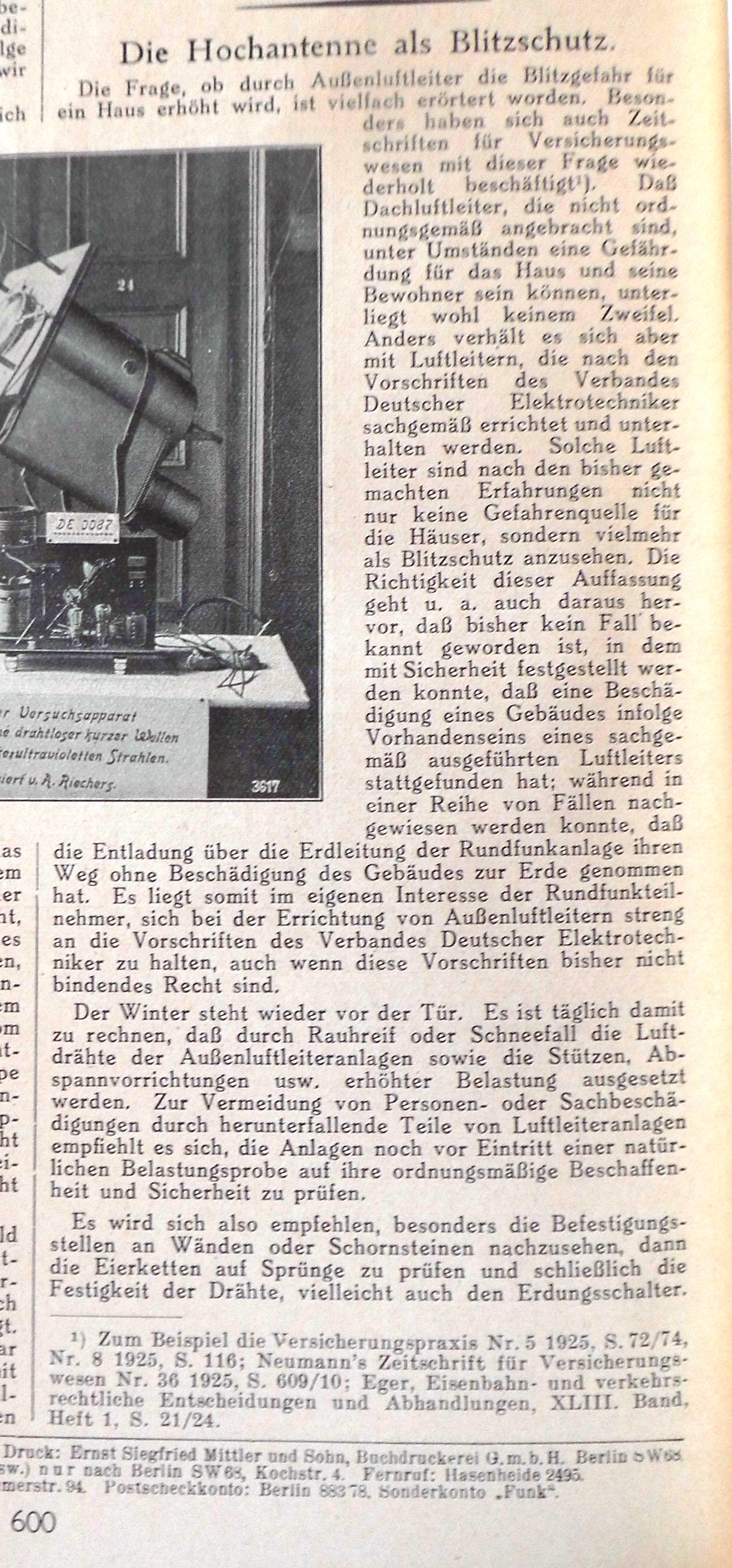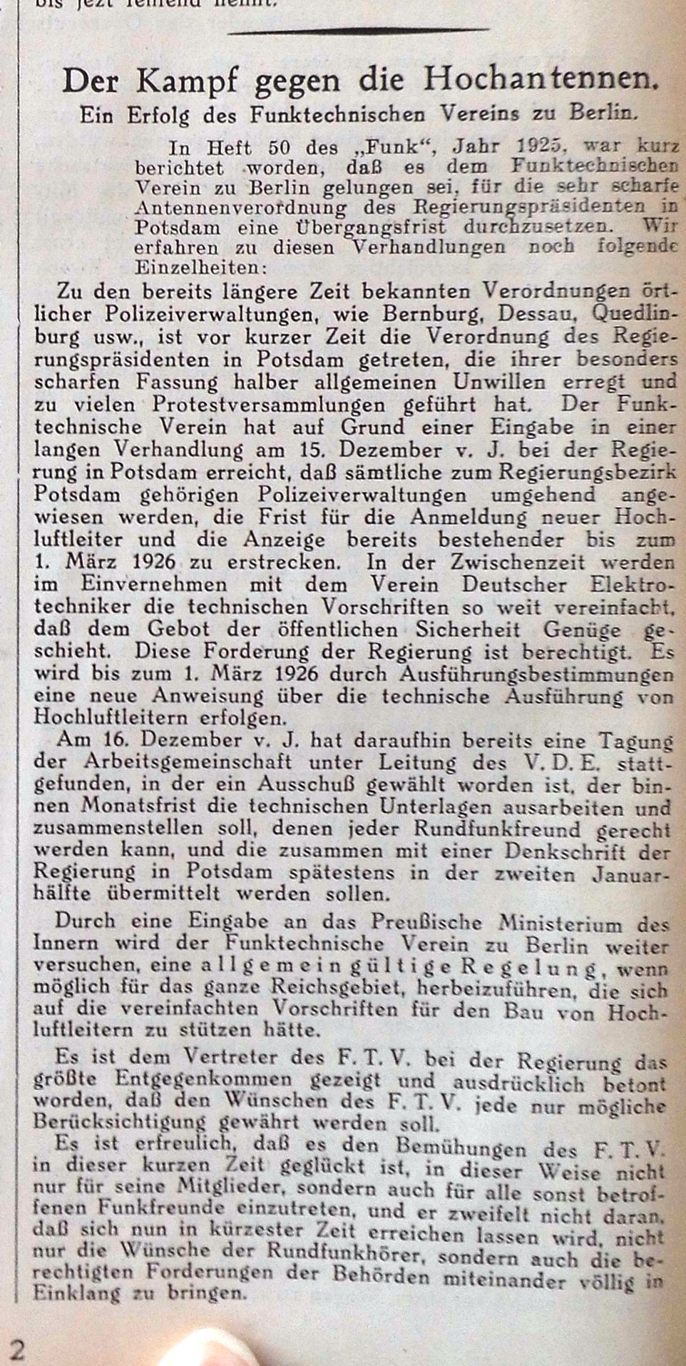 Der Funktechnische Verein (F.V.T.) Berlin kämpfte 1925 gemeinsam mit dem V.D.E. (Verein Deutscher Elektrotechniker) gegen die verschärften Bauauflagen, die den Aufbau von Hochantennen in den Städten stark einschränken sollten. Um mehr Akzeptanz für die "Außenluftleiter" zu erlangen, warb man so auch mit dem sich bei sachgemäßer Installation ergebenen besseren Blitzschutz des Hauses. (aus "Funkbastler" von 1925/1926)