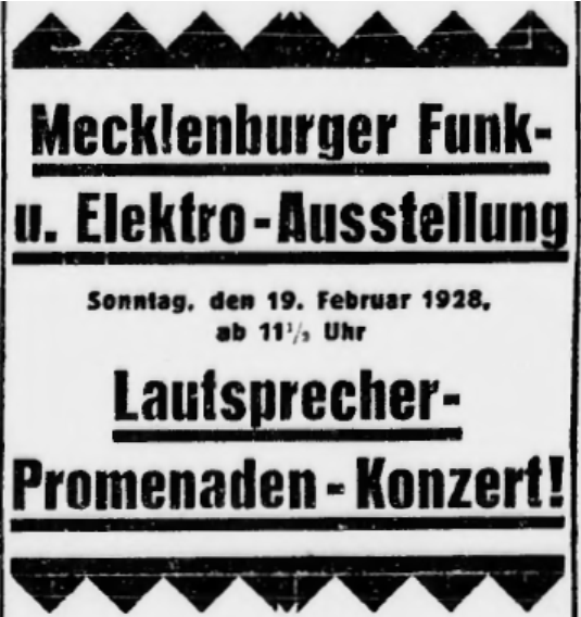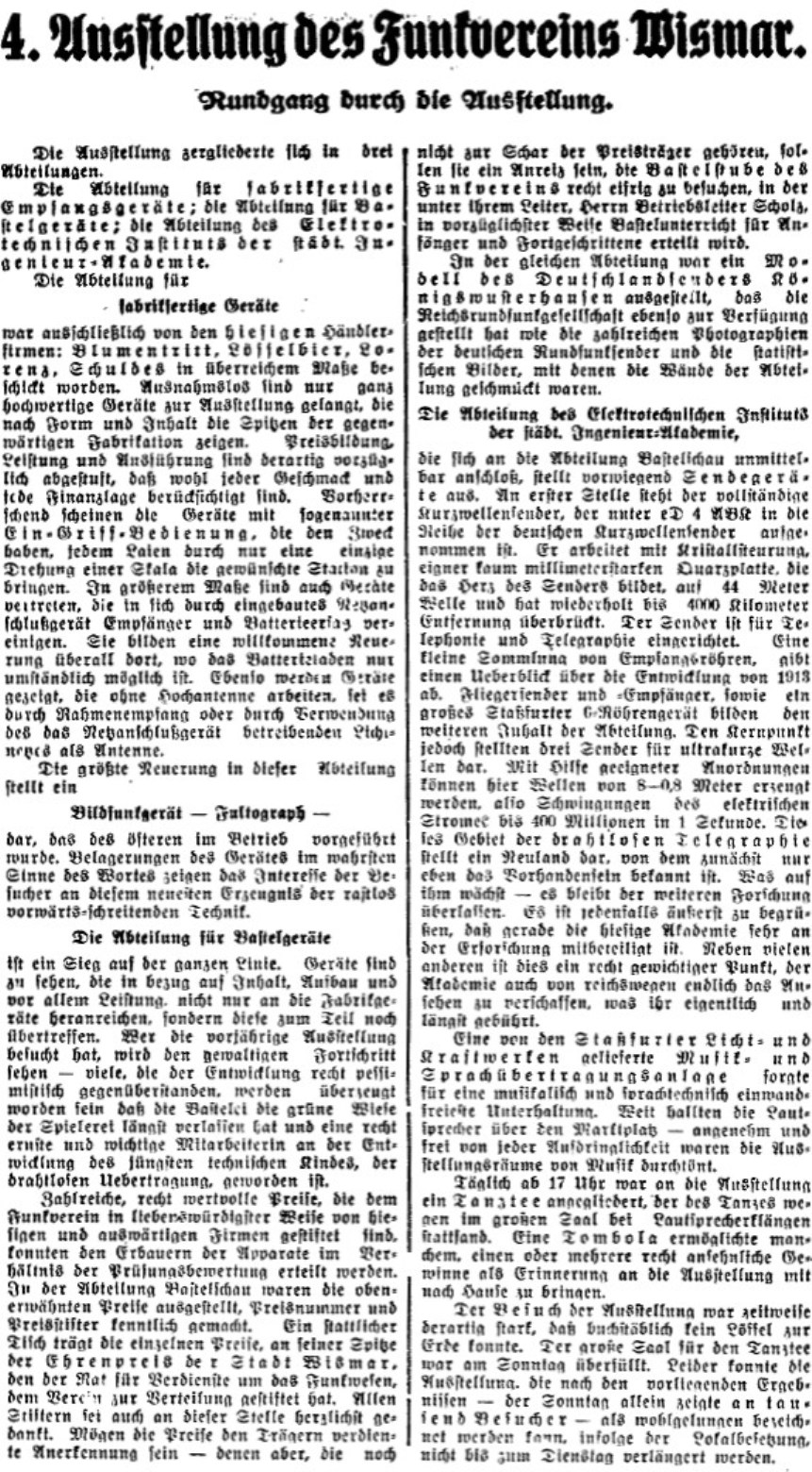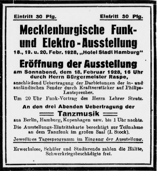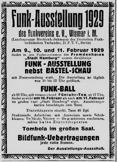 Am 9. - 11. Februar 1929 fand die bereits 4. Funkausstellung in Wismar im Hotel "Stadt Hamburg" statt. 18 Geräte konnten prämiert werden, davon einen Ehrenpreis des Rates der Seestadt Wismar. (mehr...)