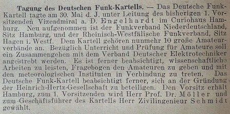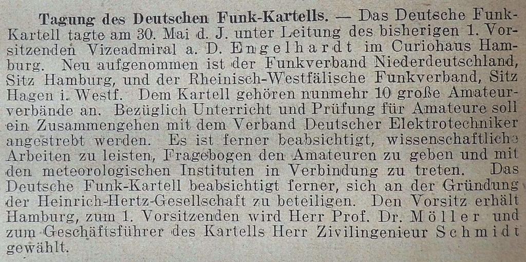 Auch wird auf der Tagung des Deutschen Funk-Kartells am 30. Mai 1924 wissenschaftliches Zusammenarbeiten (u.a. mit dem VDE und meteorologischen Instituten) angekündigt und eine Gründungsbeteiligung an der Heinrich-Hertz-Gesellschaft.