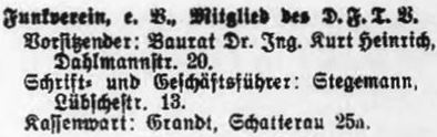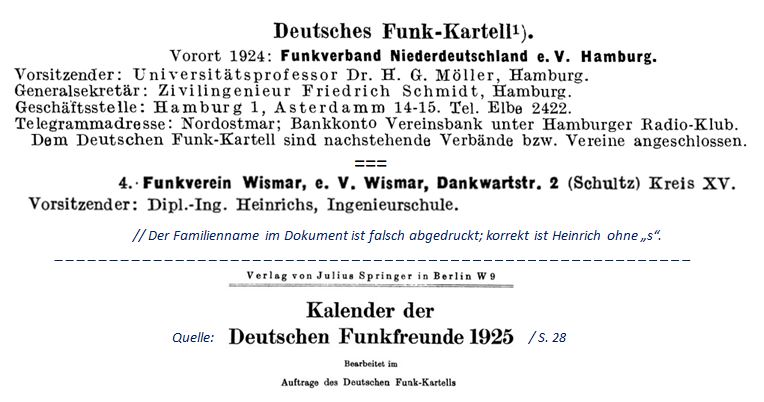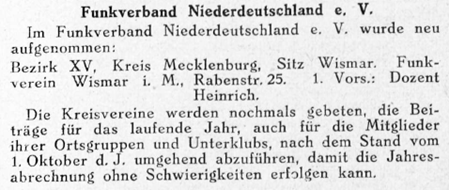 Im November 1924 erfolgte die Mitgliedschaft von Heinrichs Funkverein Wismar im Funkverband Niederdeutschland e.V. und war darüber auch Mitglied im Deutschen Funk-Kartell.