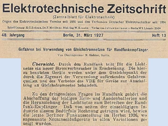 Selbst in den großen Fachzeitschriften wie die ETZ (Elektrotechnische Zeitschrift) werden Themen zu Radioschaltungen und Schutzmaßnahmen diskutiert. Hier ein Beitrag zur Gefahr, die von der Radiogerätenutzung am Gleichstromnetz ausgeht.