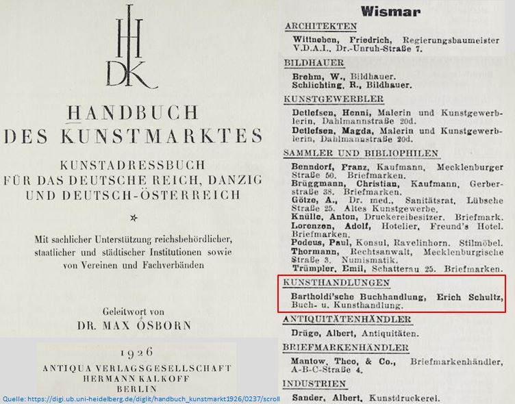 Erich Schultz kaufte die Bartholdische Buchhandlung am 3. März 1910 von Hans Bartholdi und war zu der Zeit der einzige in Wismar, der technische Bücher anbot. Die Buchhandlung ging dann am 18. Nov. 1930 an Karl Stolzenburg bzw. am 3. April 1933 an Hermann Rhein über.