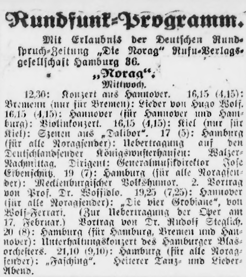 Am 2. Mai 1924, als die nun bereits fünfte Rundfunkanstalt im Deutschen Reich, ging die Norag in Hamburg auf Sendung. Hans Bodenstedt, der künstlerische Leiter des Hamburger Senders spricht „… das erste Mal … zu unseren 896 zahlenden und zu den ungezählten Schwarzhörern , die ungeduldig darauf warten, ihren Obolus zahlen zu können.“