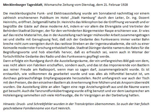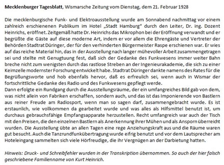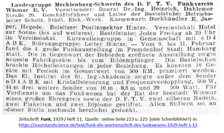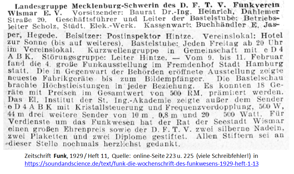 Die Geschichte, wie Heinrich mit seinem Verein in Wismar und auch deutschlandweit die vielen anderen Funk- und Radiovereine diese Aufgabe meisterten und 1924/25 aus interessierten Bürgern legale Radiohörer qualifizierten, wird im nächsten Jahr zum Gründungsjubiläum des Funkvereins Wismar e.V. vor 100 Jahren ihre Fortsetzung finden.