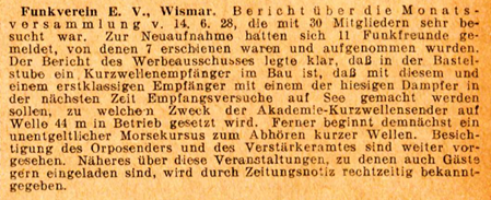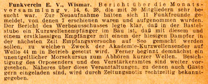 "...Aktuell (Juni 1928) 30 Mitglieder! Neuanmeldungen/Neuaufnahme von 11/7 Funkfreunden."