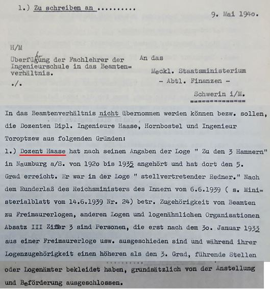 Friedrich Haase gehörte von 1920 - 1935 in Naumburg a/Sa. der Freimaurerloge "Zu den 3 Hammern" (auch Hämmern)" an und erreichte den 5. Grad. Gemäß Runderlass des Reichsministers des Innern vom 6.6.1939 war er damit "...grundsätzlich von der Anstellung und Beförderung ausgeschlossen."