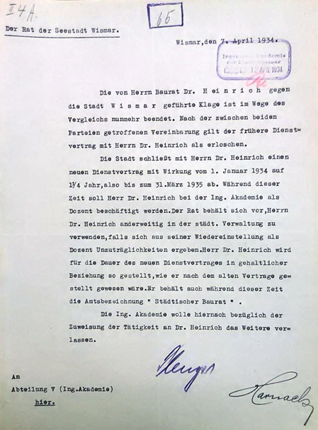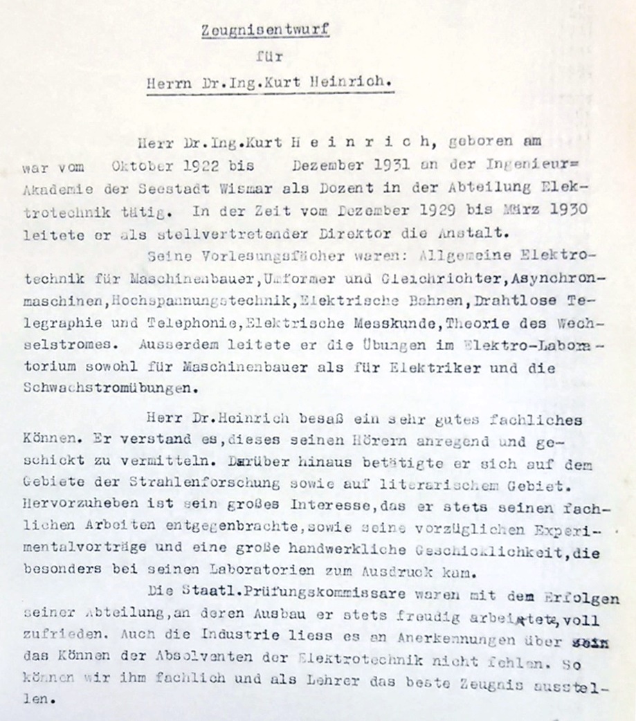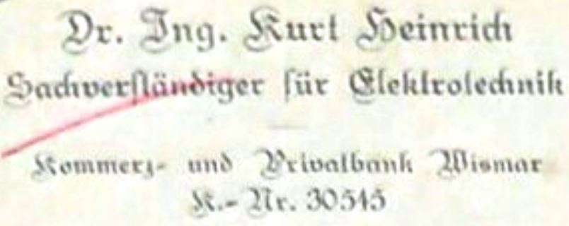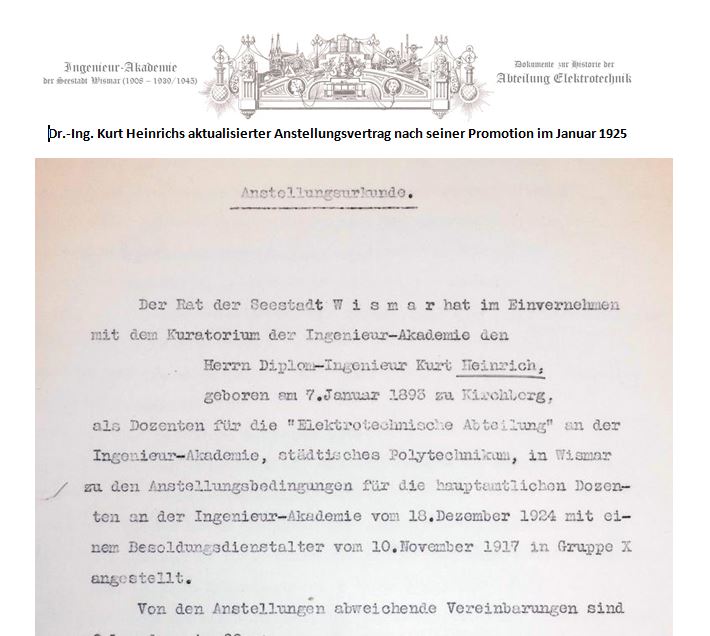 Dr.-Ing. Kurt Heinrich hat sich in den neun Jahren seiner Dienstzugehörigkeit bis zu seiner Entlassung Ende 1931 als Dozent äußerst verdienstvoll für die Abteilung Elektrotechnik engagiert. Bei den Studenten war er beliebt, er konnte begeistern und war auch handwerklich ein Fachmann. Seine Absolventen hatten über viele Jahre gute Vermittlungschancen, was Dokumente Berliner Großbetriebe wie Siemens belegen. Als wohl einer der ersten Dozenten in Wismar überhaupt betrieb Heinrich neben der Lehre noch angewandte Forschung (seine wiss. Veröffentlichungen) Dazu sind von Heinrich mindestens zwei Patente eingereicht worden. (mehr)