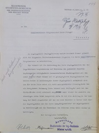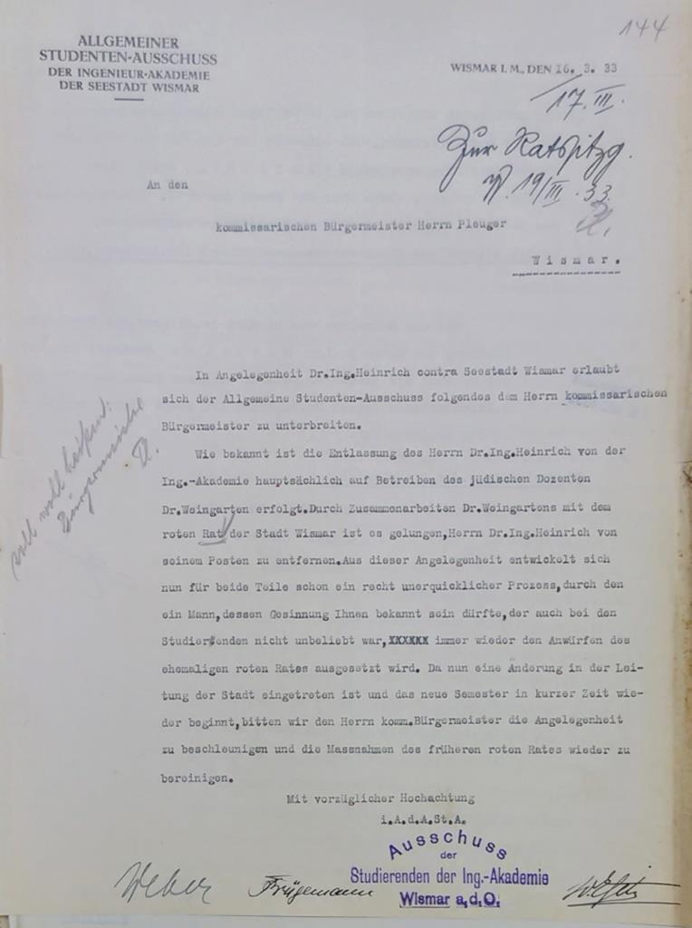 Der AStA der Akademie drängt mit Schreiben vom 16. März 1933 an den (noch) kommissarischen Bürgermeister Pleuger auf ein schnelles Ende des langjährigen Prozesses.