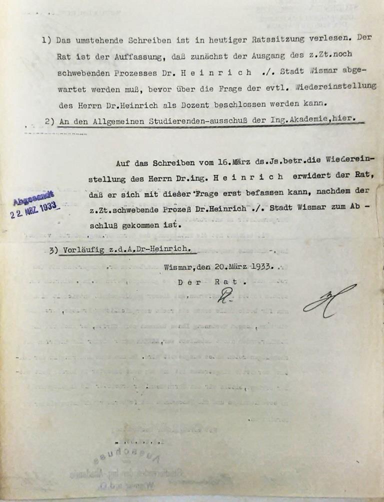 In einer Klage Heinrichs vor dem Arbeitsgericht Wismar wurde am 29. Januar 1932 in erster Instanz die Fristlosigkeit der Kündigung als unzulässig abgewiesen, aber formell die Zulässigkeit des Aussprechens einer ordentlichen Kündigung zum 31. März 1932 zuerkannt. (zur Urteilsschrift)
