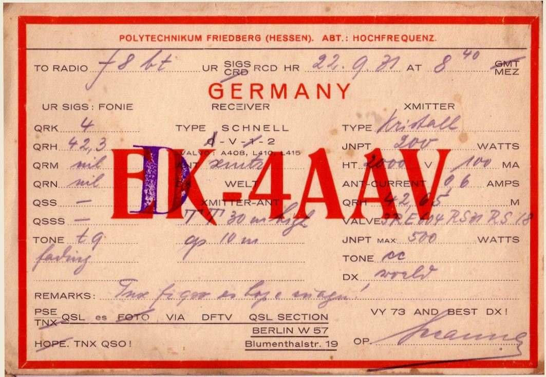 Interessant auch eine Funkkarte (QSL) der Station D4AAV (vormals EK4AAV) der Abteilung Hochfrequenz des Polytechnikums Friedberg/Hessen (heute TH Mittelhessen Campus Friedberg), eine von Wismars Akademiegründer Robert Schmidt bereits 1901 gegründete Einrichtung. Den Amateurfunk gibt es dort an der nun TH Mittelhessen noch heute!