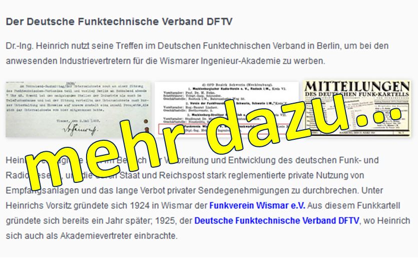 Aus diesem Funkkartell gründete sich bereits ein Jahr später am 28. Juli 1925 der Deutsche Funktechnische Verband DFTV, wo Heinrich sich auch als Akademievertreter einbrachte. Zum 1. September 1925 stellte die Deutsche Reichspost die Ausstellung der Audion-Versuchserlaubnisse ein und damit wurde der Bau von Empfängern genehmigungsfrei.
