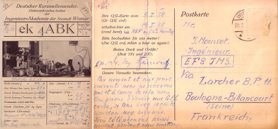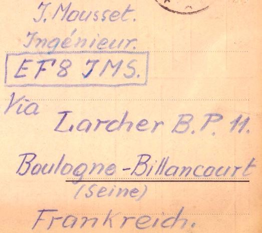 Französischer Funkpartner Heinrichs 1928... Und "natürlich" hat Heinrich die Funkbestätigungskarte (QSL) in Französisch geschrieben und sogar per Post zustellen lassen.