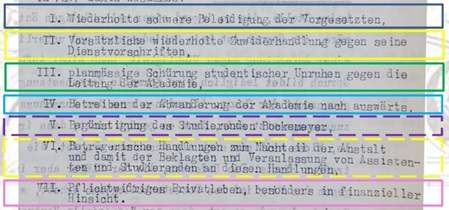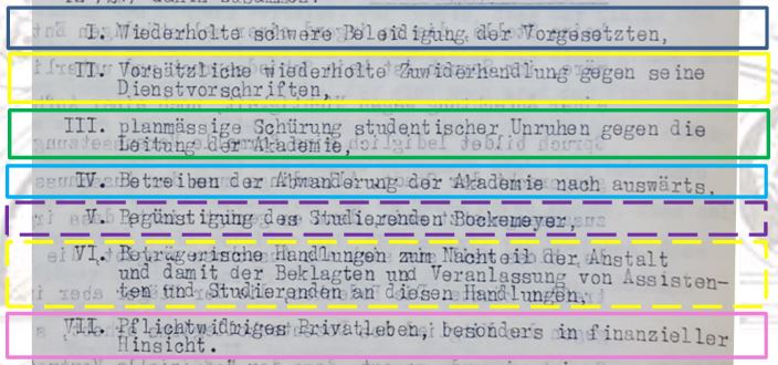 Anklage-Punkt VI: "...Betrügerische Handlungen zum Nachteil der Anstalt und damit der Beklagten und Veranlassungen von Assistenten und Studierenden an diesen Handlungen." (zur Urteilsbegründung zum Anklage-Punkt VI)