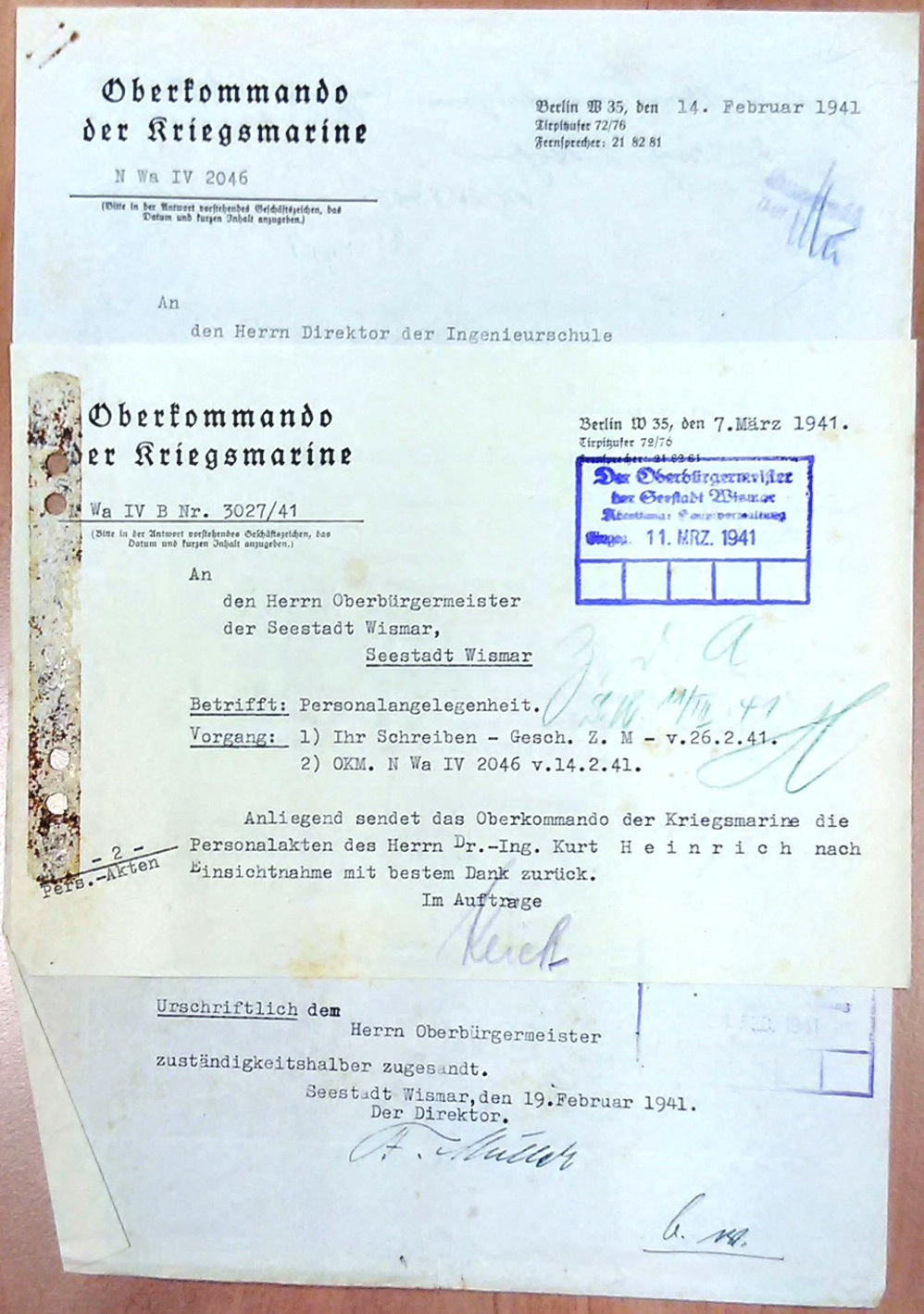 Vier Jahre später, im Februar 1941, überraschte Akademie-Direktor Müller noch ein Brief vom Oberkommando der Kriegsmarine (OKM) aus Berlin. Dr.-Ing. Kurt Heinrich sei „zur Kriegsmarine als Kriegsbeamter eingezogen worden und soll als Lehrer für Marinenachrichtentechnik beschäftigt werden“. Man bitte „um möglichst umgehende Überlassung… der Personalakten zur Einsichtnahme“. Nach 14 Tagen dortiger Vorlage kamen am 11. März 1941 die Personalakten vom OKM „mit bestem Dank“ (statt des eher üblichen Heil Hitler...) unkommentiert zurück.