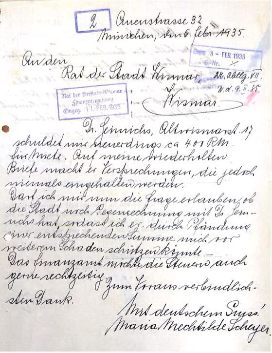 Im Februar 1935 wendete sich Heinrichs Vermieterin Maria Mechtilde Scheyer aus München (!) an den Bürgermeister, um zu erfahren, ob sie Heinrichs Mietschulden in Höhe von 400 RM eventuell lieber zeitnah pfänden sollte...