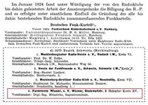 Mit Verfügung Nr. 273 vom 14. Mai 1924 wurden Versuchsgenehmigungen der Deutschen Reichspost für wissenschaftliche Institute, Fachunternehmen und einige Privatpersonen ausgereicht; darunter technische Reichspost-Beamte.