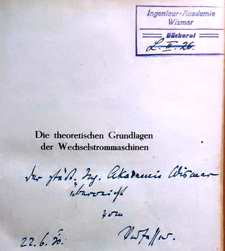 Am 22. Juni 1930 überreichte Dr. Heinrich mit einer Widmung sein Buch der Akademie-Bücherei. Und dieses Buch konnte bei den Recherchen 2018 im Bestand der Bibliothek der Hochschule Wismar wiedergefunden werden!