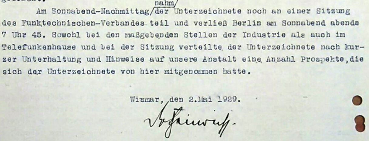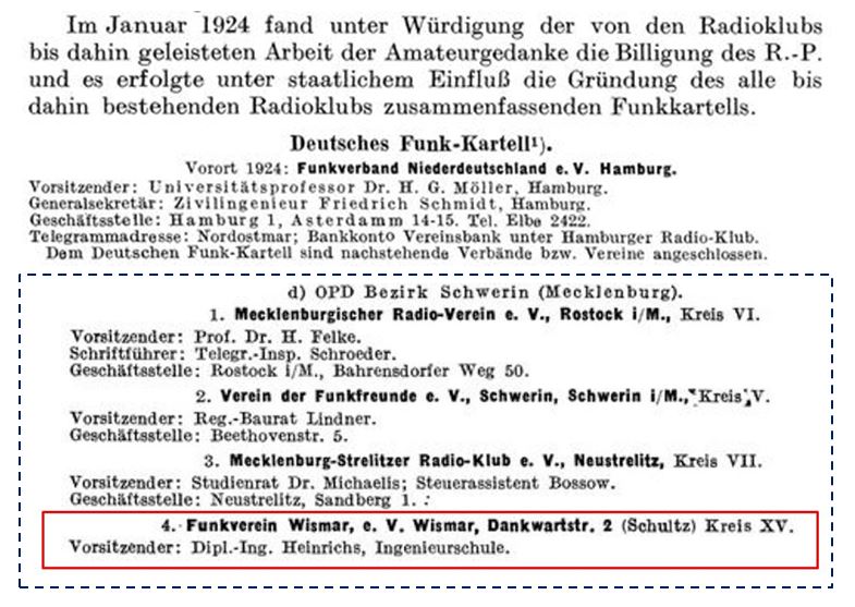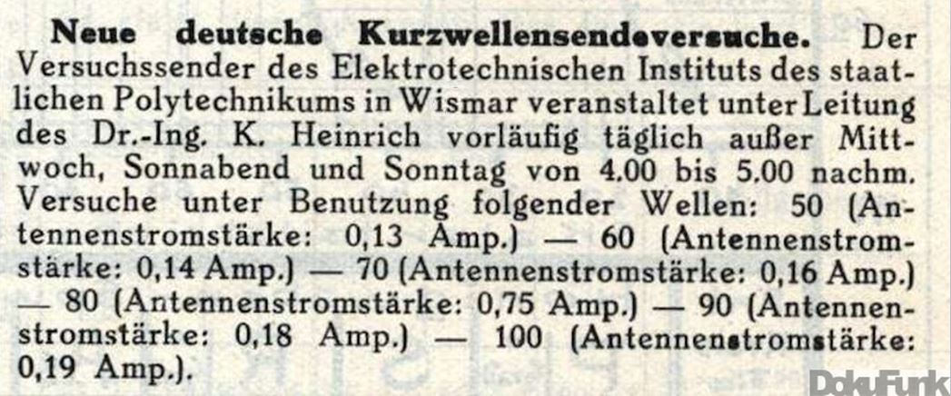 1925 kündigte Dr.-Ing. Heinrich im "Funkbastler" (das war keine einfache "Bastelzeitung", sondern das Fachblatt des Deutschen Funktechnischen Verbandes e.V.) neue Sendeversuche an. Das ist aktuell der früheste Beleg für in Wismar praktisch betriebenen Funk-Sendebetrieb: