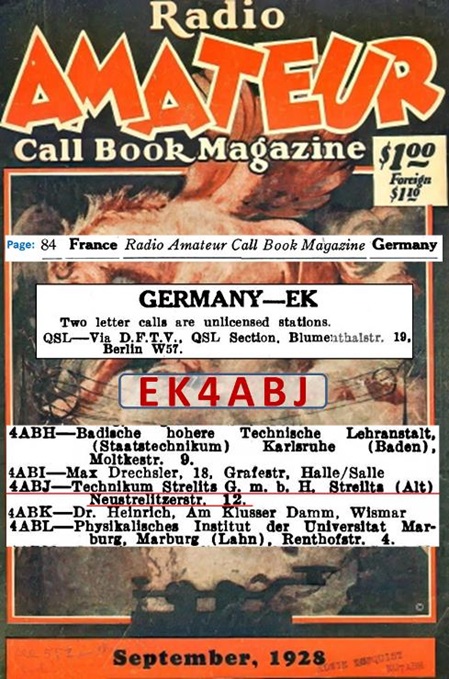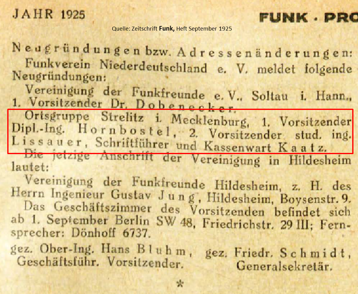 Im September 1925 gründete sich am Technikum Strelitz (Strelitz ab 1931 Stadtteil von Neustrelitz) ein Funkverein Strelitz als Ortsgruppe des Funkvereins Niederdeutschland. Der 1. Vorsitzende war Dipl.-Ing. Wilhelm Hornbostel, dem 2. Vorsitzenden Studenten (stud. ing.) Lissauer und mit dem Schriftführer und Kassenwart Kaatz. - In der Rufzeichenliste der ARRL vom September 1928 taucht (bislang einmalig) das Rufzeichen auf - EK4ABJ / EK waren in Deutschland ab dem 01.02.1927 - xx.xx.1929 gültigen Rufzeichen.