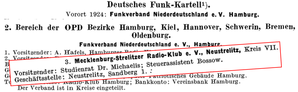In der Liste des Deutschen Funk-Kartells von 1925 findet sich ein Mecklenburg-Strelitzer Radio-Klub e.V. Geleitet durch den Studienrat Dr. Michaelis und einem Steuerassistenten Bossow als Stellvertreter. Als Geschäftsstelle wird der Sandberg 1 in Neustrelitz benannt.