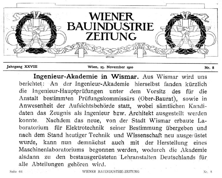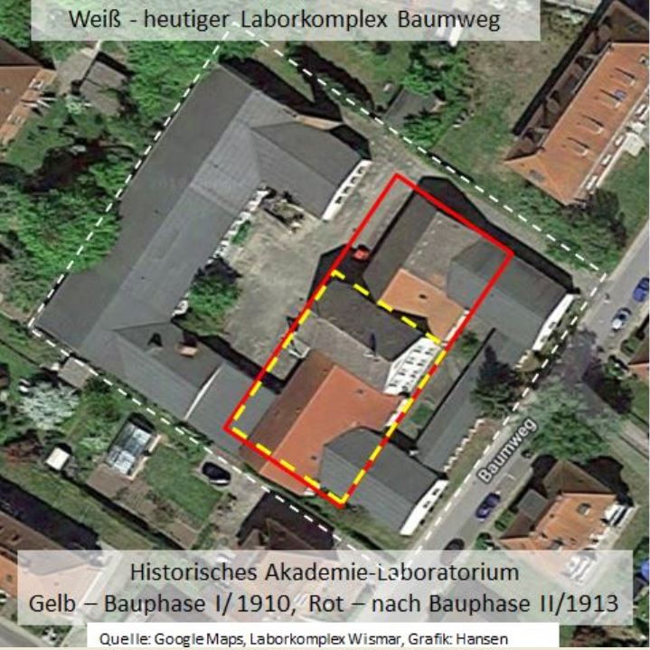 Am 3. Dezember 1910 wurde der Abteilung Elektrotechnik der zwei Jahre zuvor gegründeten privaten Ingenieur-Akademie das zuerst erstellte Labor eines Laboratoriums am späteren Baumweg (Nr. 3?) zur Nutzung übergeben - dem ersten Hochschulneubau Wismars überhaupt und dem ersten Gebäude eines damals geplanten neuen Akademie-Campus. (mehr dazu im Jubiläumsartikel von 2019) / online