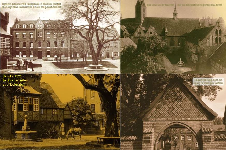 Das Hauptgebäude der Akademie befand sich von 1908 bis 1935 in der Wismarer Neustadt. (später als Studiengebäude I bezeichnet) Dafür hatte die Stadt die ehemalige Mädchenschule am Heilig-Geist-Hof rückseitig der Heiligen-Geist-Kirche zur Verfügung gestellt. Als sog. Studiengebäude II wurde die ehemalige St. Georgenkirch-Schule unterhalb der St. Georgenkirche ab (?) der Akademie für Konstruktions-, Bibliotheks- und Leseräume zur Verfügung gestellt.
