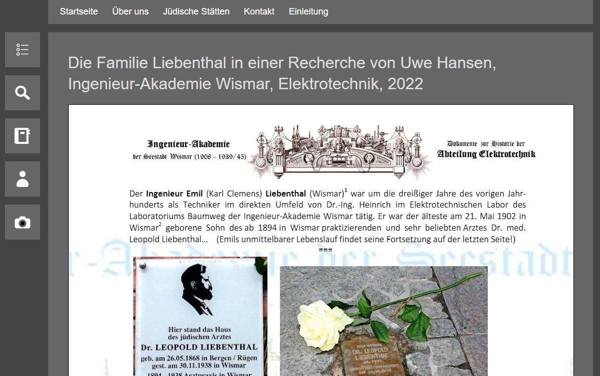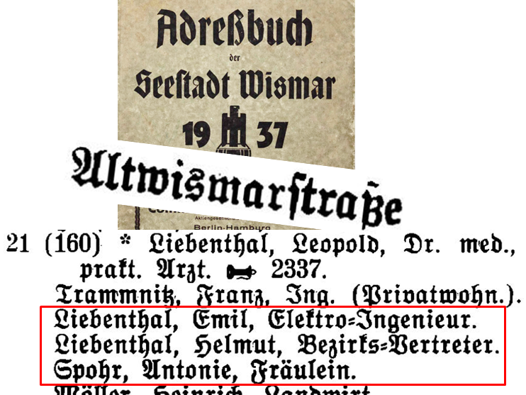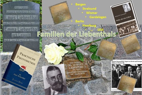 Die Liebenthals, eine jüdische Familie von Kaufleuten und Akademikern (<=Link/Download zu PDF, 25 Seiten/ 4.8MB) waren und sind auch weit über die Grenzen Deutschlands hinaus bekannt. Der Vater des Ingenieurs Emil Liebenthal war der ab 1894 in Wismar praktizierende und sehr beliebte Arzt Dr. med. Leopold Liebenthal, geboren auf der Insel Rügen, in Bergen. Seine beiden in Wismar zur Welt gekommenen Söhne Emil (1902) und Helmut (1907) studierten. Emil wurde Elektroingenieur und Helmut studierte noch bis 1933 in Rostock Medizin... Mit der Machtergreifung der Nazi wurde der Hass auf die Juden ständig politisch neu befeuert und fand seinen ersten Höhepunkt in den Novemberpogromen von 1938. Sie leiteten eine beispiellose menschenverachtende Judenverfolgung bis zur physischen Vernichtung ein. Auch die Liebenthals blieben nicht verschont... (Projekte zur Erinnerung an verfolgte und ermordete jüdische Bürger in MV)