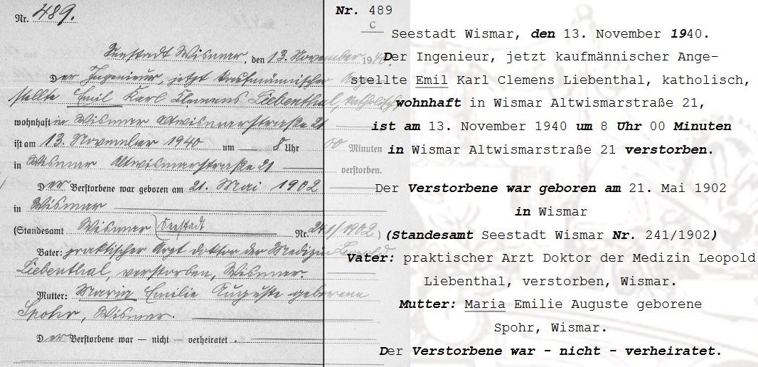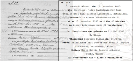 Leider war bislang zu den Umständen seines frühen Todes mit nur 38 Jahren nichts in Erfahrung zu bringen. Nach Eintrag im Sterbebuch (der damals Seestadt) Wismar ist er als in der Altwismarstr. 21 (ehemals Haus seiner Eltern!) wohnhaft und um 8 Uhr am 13. November 1940 verstorben registriert worden. Die Anzeige dazu erfolgte durch die Leichenkleiderin Anna Breest geb. Ball aus Wismar. (siehe Original-Dokument, Klick auf linke Grafik; rechts zu den Grabstellen der Liebenthals in Wismar).