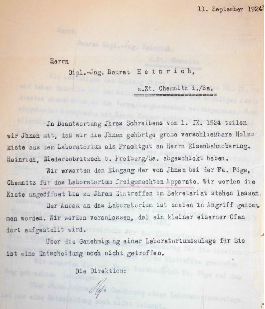 Dr.-Ing. Kurt Heinrich war im Alter von 24 Jahren gleich nach seiner Diplomprüfung im November 1917 als Prüffeldingenieur in der Fa. Pöge in Chemnitz eingestiegen und wurde in der neu errichteten Abteilung zur Herstellung von Kleinstelektromotoren mit dem Aufbau und der Leitung der Prüf- und Versuchsfelder betraut. Als Oberingenieur wechselte er 1922 nach Wismar. Die Verbindungen hielt er noch lange aufrecht und fand von dort weiterhin insbesondere großzügige materielle Unterstützung. Beispiel Brief von 1924