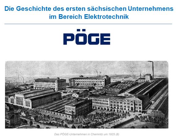 Gründung 1874 in Chemnitz durch Friedrich Hermann Pöge. Umwandlung in eine "Elektricitäts-Aktiengesellschaft vormals Hermann Pöge" im Jahr 1897. Umbenennung in "Pöge Elektricitäts-Aktiengesellschaft" ab 1919.
