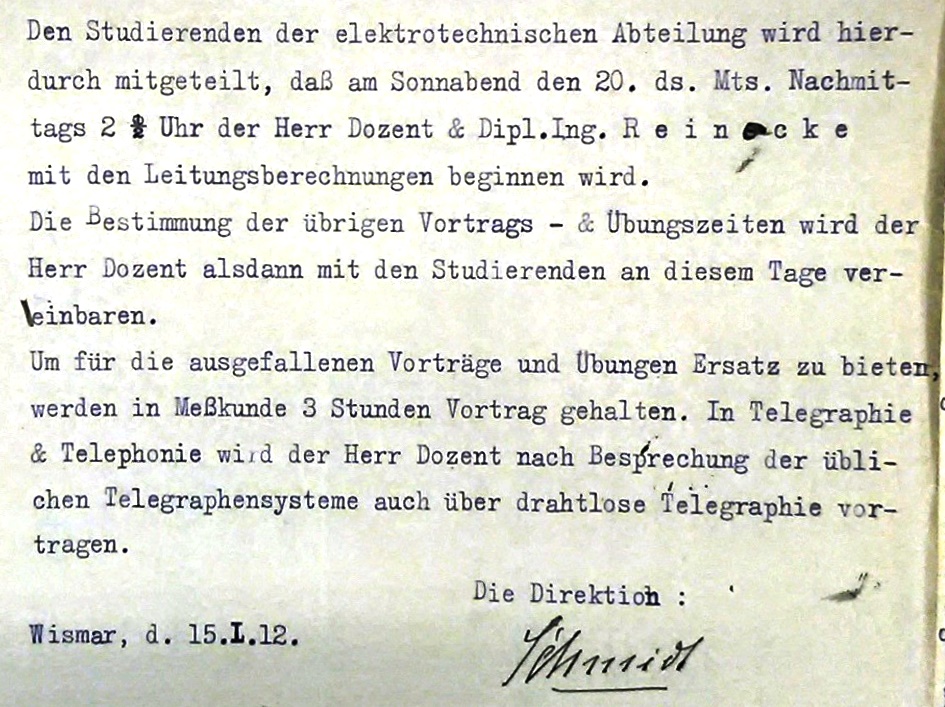 Akademiedirektor Schmidt hatte Dipl.-Ing. Reinecke am Jahresende 1911 eingestellt. Er war der dringend notwendig gewordene Ersatz für den Ing. Weber. Es war eine gut gemeinte Idee, den Studenten zügig den ausgefallenen Unterrichtsstoff anzubieten. Dazu dieser Aushang vom Direktor Schmidt mit der Ankündigung der ersten Lehrveranstaltung dazu an einem Samstag Nachmittag.