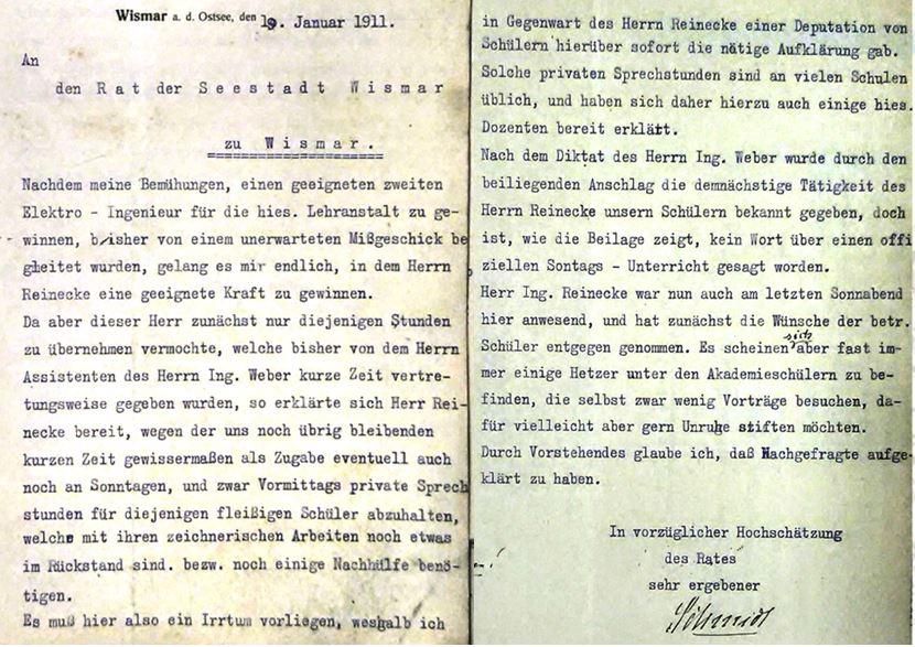 Auf diese Beschwerde hin wird Direktor Schmidt vom Rat zu einer Stellungnahme aufgefordert. In dieser wird Reinecke als Assistent von Weber dargestellt.