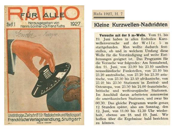 In der Woche vom 11. - 19. Juni 1927 erfolgte ein weltweiter Kurzwellen-Ausbreitungstest auf 5m /ca. 60 MHz (!), realisiert durch das bereits vorhandene weltweite Netz von Funkamateuren! Die "Kommerziellen" konnten diese Dichte von Funkstationen nicht ansatzweise abdecken.