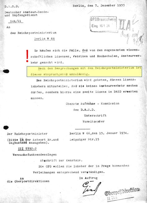 Doch viele dieser institutionellen Erstlizenzler (die "wissenschaftlichen Lizenzen" im Sprachgebrauch des D.S.A.D.) beteiligten sich häufig auch auch am internationalen Amateurfunk. Formal illegal, aber viele Jahre geduldet. Das abrupte Ende dieser Duldung kam mit der Eingabe des D.A.S.D. beim Reichspostministerium am 7. Dezember 1933, die sich über die "... sogenannten wissenschaftlichen Lizenzen, Fabriken und Hochschulen, ..." beschwerten. (mehr dazu)
