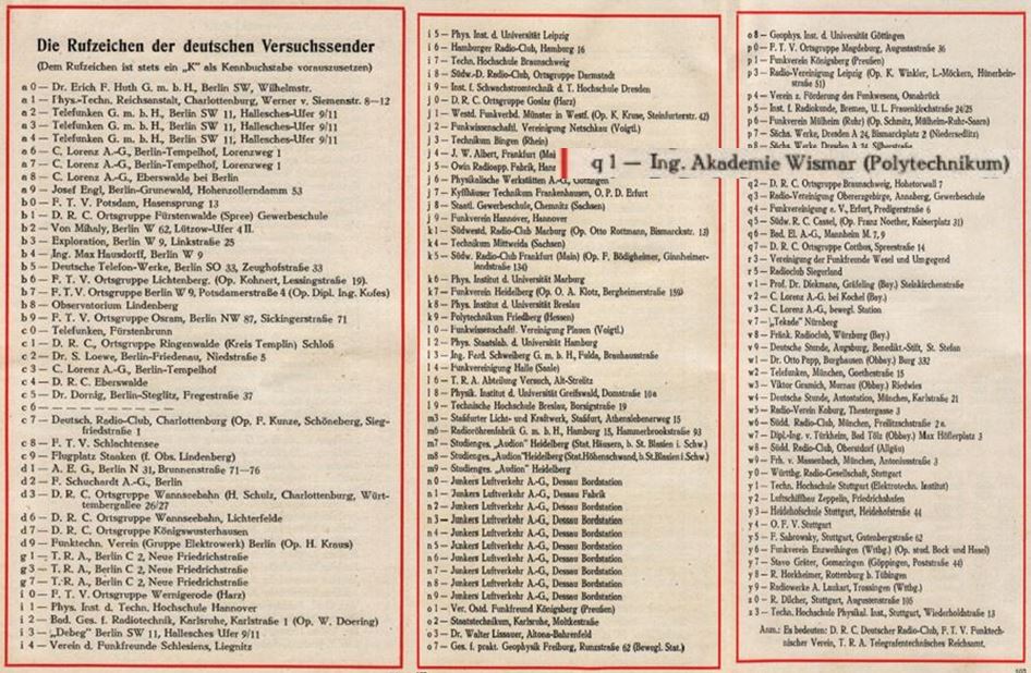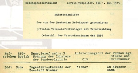 1935 werden die Funkgenehmigungen neu sortiert. Die Wismarer Ingenieur-Akademie erscheint nun wieder in einer Rufzeichenliste mit einer D2-Genehmigungen für „...genehmigte private Versuchsfunkanlagen mit Fernstrahlung“ (einschl. der Versuchsanlagen der Deutschen Reichspost/ DRP) - also wieder in der Gruppierung der „Institutionellen“; ausgegeben vom Reichspostzentralamt mit Datum vom 1. Mai 1935.