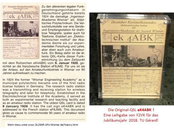 1924 gehörte die Ingenieur-Akademie Wismar (als Polytechnikum Wismar) zu den allerersten Versuchsfunk-Genehmigungsinhabern Deutschlands. Erstrufzeichen Q1. Es folgen KQ1, K4ABK, EK4ABK, D4ABK, D2DT.